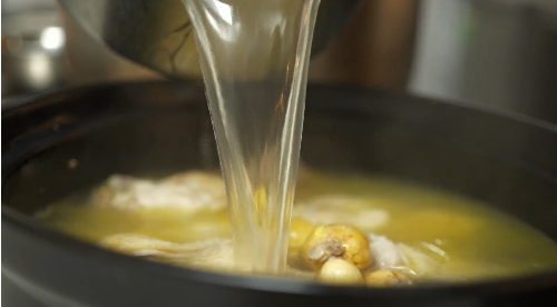 將切好的雞塊和雞湯用瓦盆裝上