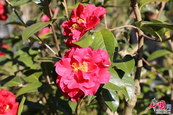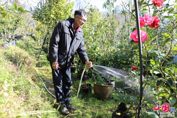清晨的小山村,薄霧籠罩,清脆的鳥鳴聲回響山谷,朵朵山茶迎風綻放,層層花瓣嬌嫩淡雅,色似胭脂、艷若桃李。一大早,蘭成新就穿梭在紅花綠葉間,十年如一日地呵護著自己栽培的每一株山茶。