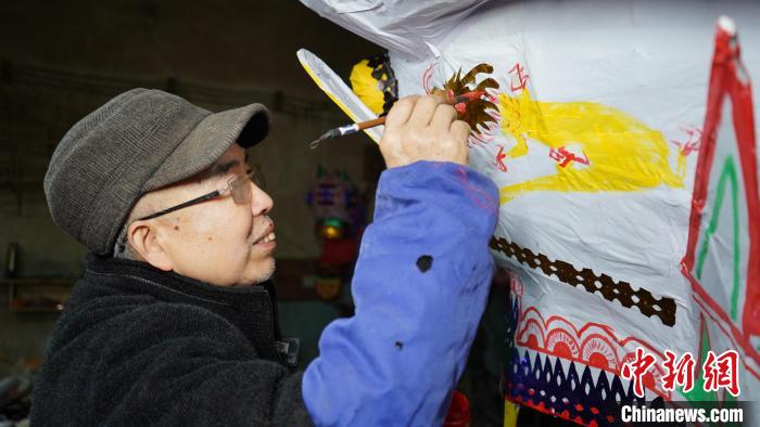 正值臘月,貴州省思南縣許家壩鎮黔綱社區,72歲的民間手藝人劉裔松跟妻子正忙著制作龍燈頭?!褒堫^是整條龍最復雜的部分,編制框架要兩三天,糊紙要一天多,繪圖也需要兩天?!眲⒁崴梢贿吔榻B,一邊給龍燈頭做調整。