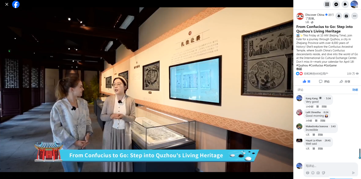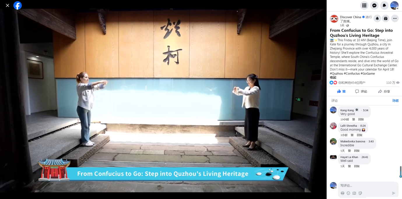 4月18日,直播團隊來到浙江衢州,白俄羅斯主持人Kate在講解員的帶領下,分別到孔氏南宗家廟和衢州圍棋國際交流中心進行參觀游覽,了解到了孔氏南宗歷史、孔子思想以及圍棋起源和文化發展。值得一提的是,本場直播邀請到了孔子的第76代嫡長孫孔令立作為特別嘉賓,為主持人和海內外網友深度介紹“南孔圣地衢州有禮”的核心內涵,闡述儒家文化思想,傳遞中華文化的博大精深。